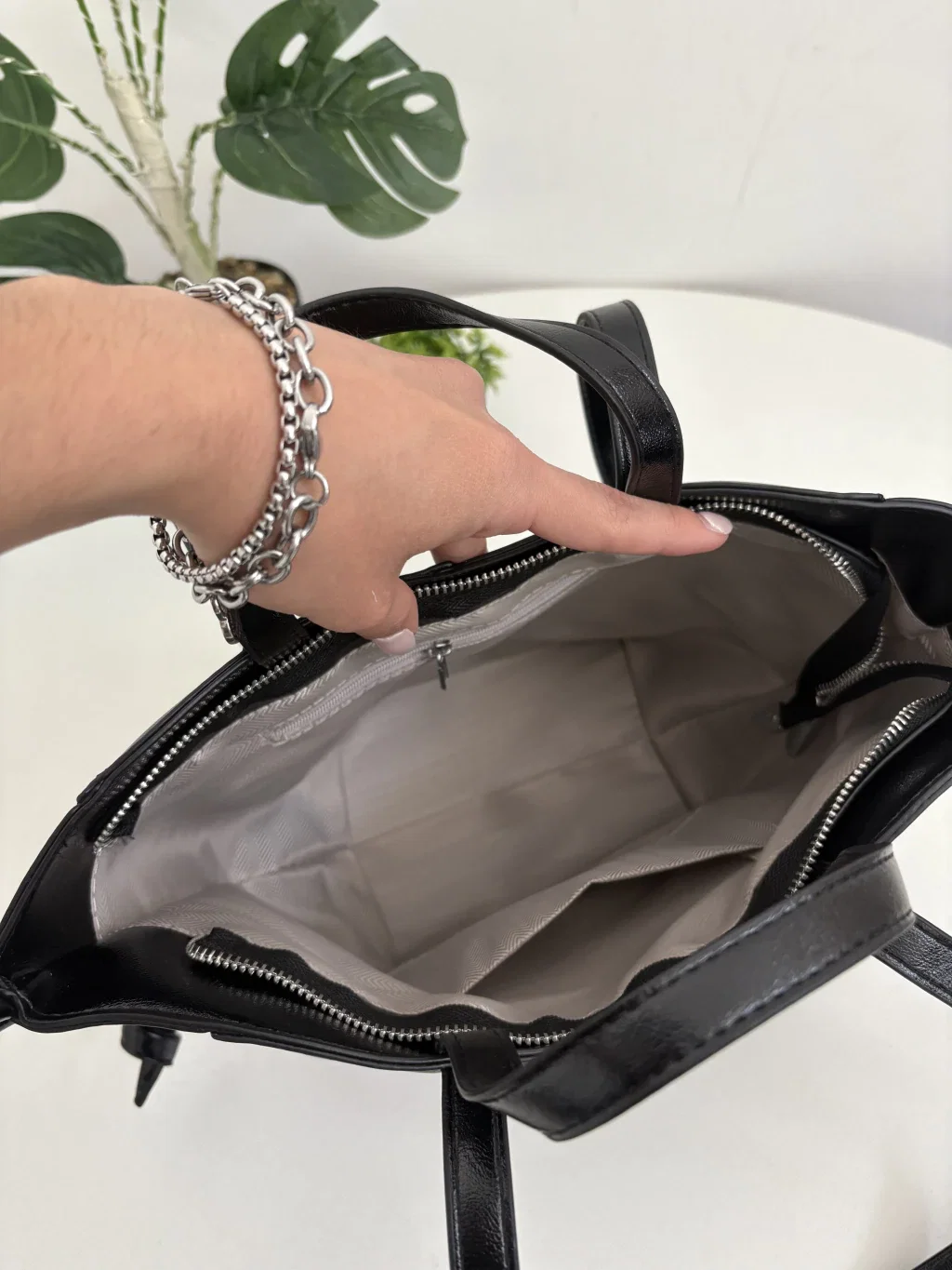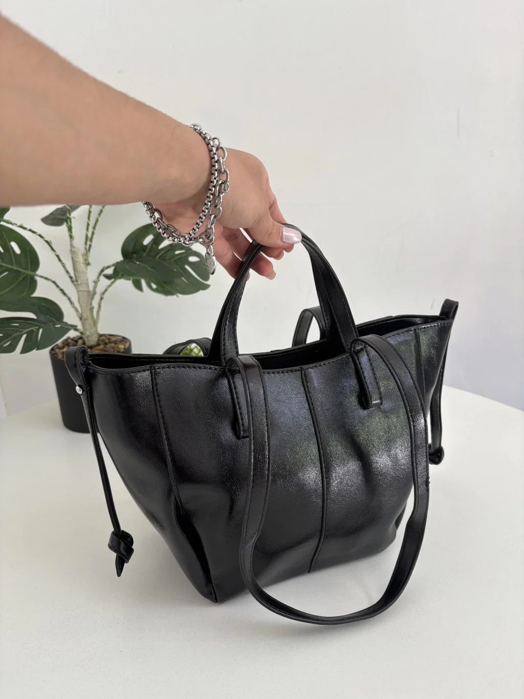 Esta cartera es el equilibrio perfecto entre lo moderno y lo clásico. Con su diseño tipo "tote" pero con una estructura más original, la Bag Indie es ideal para la mujer que busca algo cómodo pero con mucha personalidad. El acabado negro con ese brillo sutil le da un toque re elegante que levanta cualquier outfit, desde unos jeans hasta algo más producido.