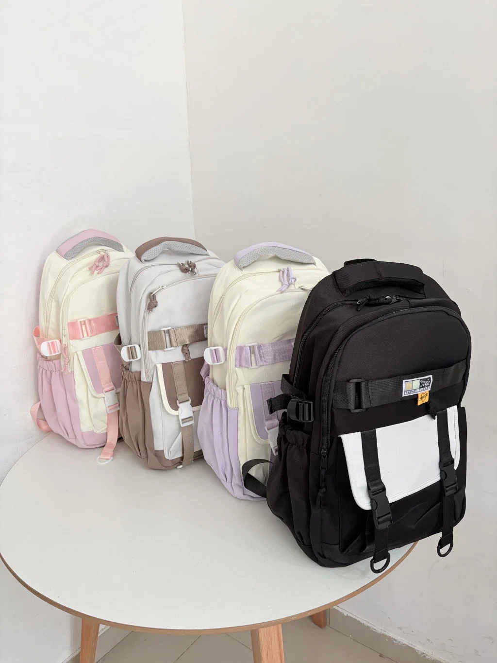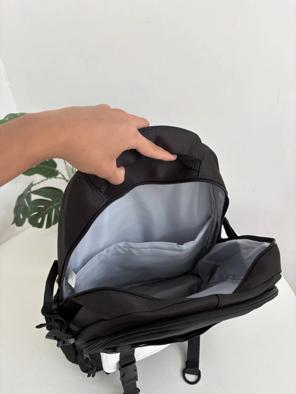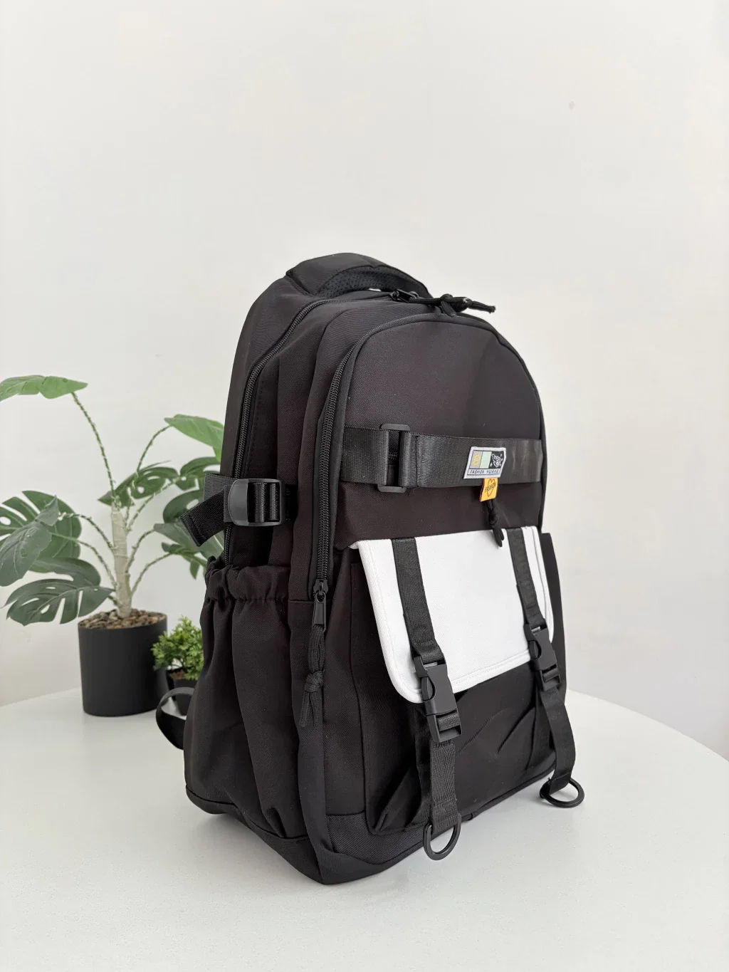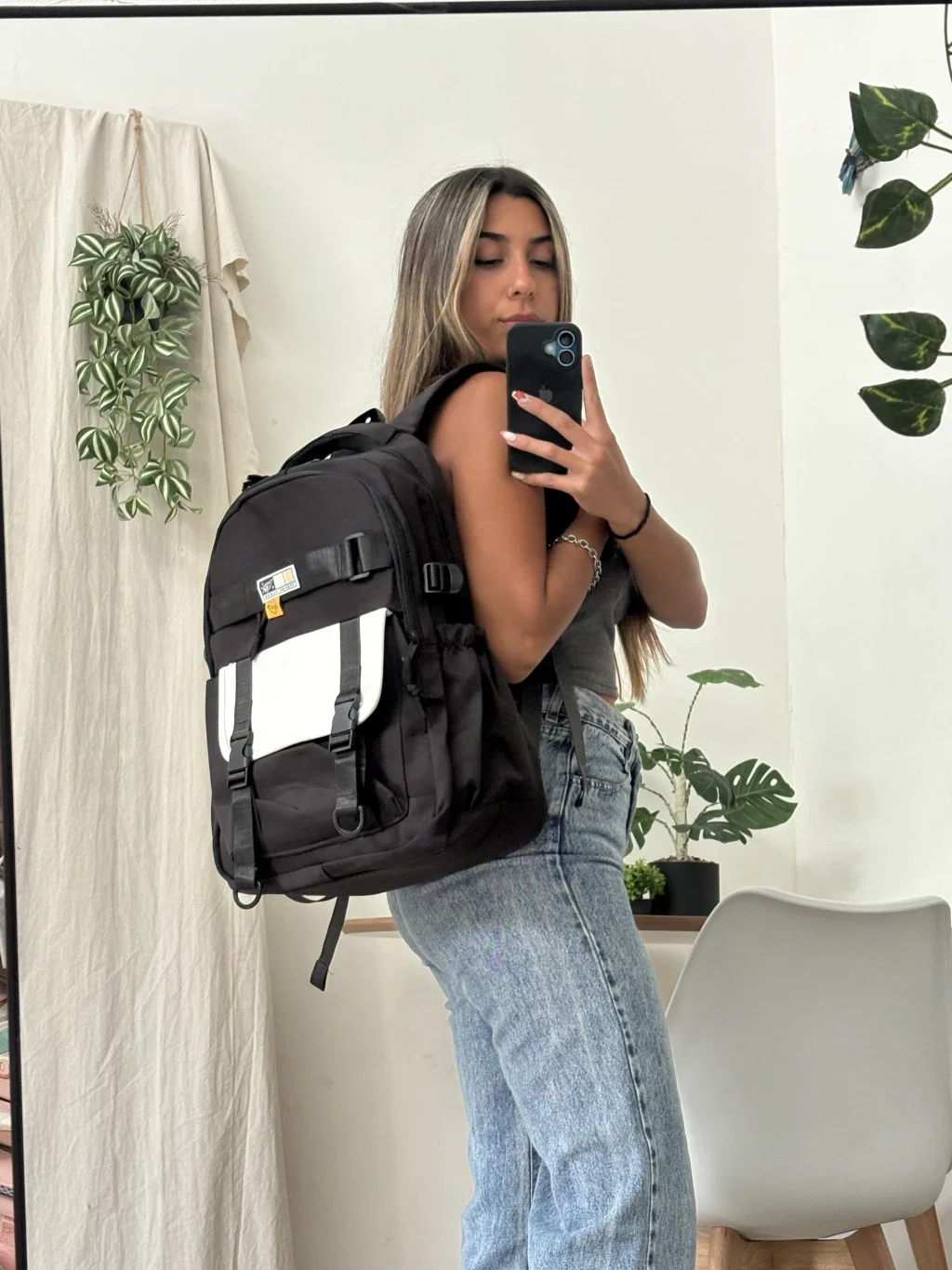 ¡Esta mochila es puro estilo urbano y aguante! Con su combinación clásica de negro y crema, tiene esa onda aventurera y moderna que va con todo. Sus correas frontales con hebillas no solo se ven geniales, sino que le dan ese toque de seguridad extra para que nada se escape.