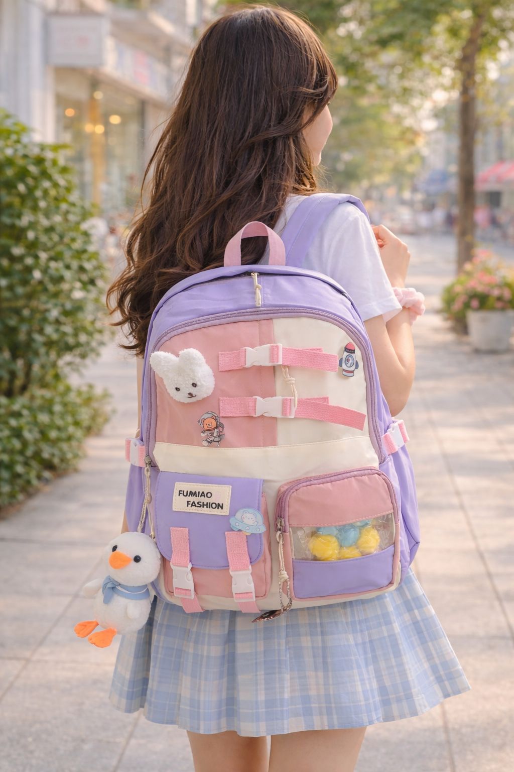 Esta mochila combina un estilo juvenil y "aesthetic" con una organización superior. Su diseño en bloques de color (Violeta, rosa y crema) ofrece un aspecto moderno y versátil, ideal tanto para el estudio como para el uso diario.