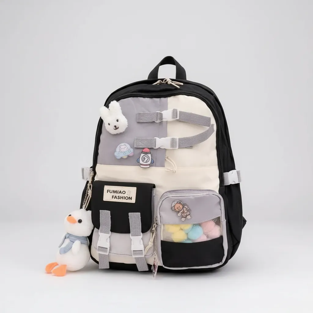 Esta mochila combina un estilo juvenil y "aesthetic" con una organización superior. Su diseño en bloques de color (negro, gris y crema) ofrece un aspecto moderno y versátil, ideal tanto para el estudio como para el uso diario.